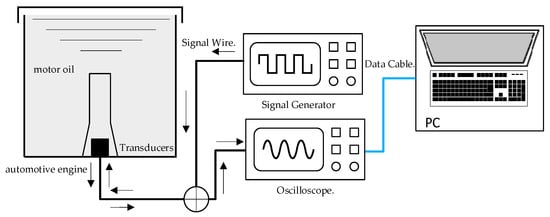 In this section, the algorithm’s performance is verified through its application in measuring an engine’s oil level. The engine oil level is a critical parameter that affects automobile operation. Ultrasonic oil level gauges operate on the principle of measuring the propagation time of ultrasonic waves in the oil and estimating ultrasonic echo signals. The experimental setup for measuring the oil level included an integrated immersion ultrasonic transducer, a pulse generator, a digital oscilloscope, an oil tank, a high-speed switch, and a computer. Figure 10 shows the schematic diagram of the system.