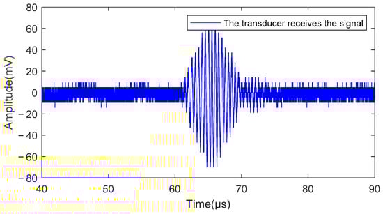 The signal generator produced pulses that drove the transducer to generate ultrasonic waves. The ultrasonic signal, propagated through the oil medium, was reflected by the oil surface, received and converted into an electrical signal by the transducer, and, finally, collected using the oscilloscope. The oscilloscope had a sampling frequency of 1 GHz, collecting 50,000 data points at intervals of 0.001 . Figure 11 displays the original echo signal, indicating the presence of high-frequency noise before 60 and after 75 .