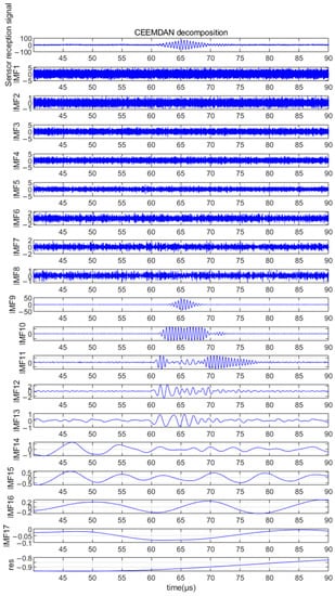 Although EMD is commonly used for the decomposition of non-smooth signals, it suffers from modal mixing. To solve this problem, Huang et al. [] proposed a new time-frequency analysis method, EEMD. EEMD is based on the EMD method and introduces randomization processing and integration methods to overcome the shortcomings of EMD. However, EEMD still has some drawbacks. For example, the decomposition process of a composite signal is independent and they are not linked, which can lead to incomplete decomposition []. To overcome the drawbacks of EEMD, the CEEMDAN algorithm was proposed by Torres et al. []. In this algorithm, reconstruction errors are gradually eliminated through the adaptive addition of while noise to each signal decomposition level, thus reducing mode mixing, while ensuring the effectiveness of the signal decomposition []. The first step of the method presented in this paper is the application of CEEMDAN for the decomposition of the ultrasonic echo signal.