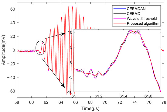 To illustrate the noise suppression effects of different methods, the 58 –78 range was highlighted, as presented in Figure 15. The proposed algorithm was compared to several traditional denoising methods, including CEEMD, CEEMDAN, and the wavelet thresholding algorithm. Our results demonstrate that the proposed algorithm achieved a smoother and more complete received signal at the receiving peak compared to the other three methods, which exhibited some noise in the parts before 60 and after 75 .