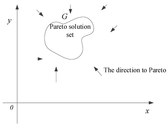 In Figure 1, within the region G satisfies , that is, the region G represents the closed region composed of the Pareto solution set, and arrow “ “ represents the direction pointing to the Pareto solution set.
