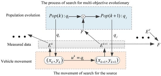 Combined with Figure 4, the source seeking process can be described as follows. At the time k, a certain is selected from the evolutionary population Pop(k) with medium probability as the motion parameter of the carrier, and the carrier obtains the motion displacement of by executing . The and at positions and are measured by carrier movement and then substituted into Equation (5) for the multi-objective solution, and the multi-objective function F is calculated. According to the convergence state of the multi-objective function F, the source seeking performance of the executed samples is evaluated, and the breeding or elimination operation is used to increase or decrease the proportion of such samples. Through the mutation operation to improve the population diversity, a new population Pop(k + 1) is obtained, and the next round of the searching process is re-entered. Through repeated iterations, the multi-objective function converges to the minimum, and the source search task is realized.