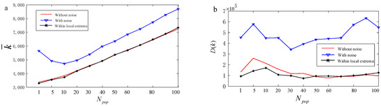 In a noise-free environment, the impact of different population sizes on the source search performance was simulated and analyzed by measuring the noise levels and extreme local conditions. The statistical results are presented in Figure 12 below.