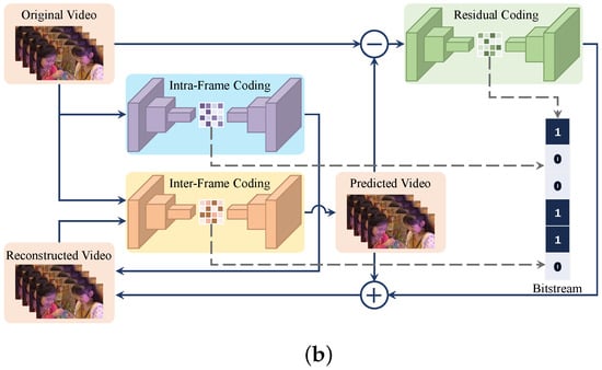 In traditional hybrid video coding frameworks (shown in Figure 1), such as AVC, HEVC, and VVC, coding tools basically perform rate–distortion optimization on their own within a specific codec structure. Currently, modularized neural video coding (MOD-NVC) integrates a modular learning-based coding tool into the traditional video coding framework, either as a stand-alone module replacing the original module,  as an enhancement to the original module, or as a part of the coding strategy. MOD-NVC can improve the performance of traditional video coding algorithms but is still constrained by the coupling between coding tools; so, MOD-NVC is a local optimization of the traditional hybrid video coding framework. In contrast, end-to-end deep video coding (E2E-DVC) can overcome these shortcomings and enable a simple replacement of the network model to an overall end-to-end optimization. As shown in Figure 1, an E2E-DVC model is essentially a deep learning model based on autoencoders (AE), and most existing E2E-DVC models still follow the basic idea of hybrid coding. Currently, a variety of different neural network structures are used in the design of AE, including the use of convolutional neural network (CNN), recurrent neural network (RNN), generative adversarial network (GAN), long short-term memory (LSTM), gated recurrent unit (GRU), and attention mechanism [], which significantly improve the E2E-DVC models’ performance.