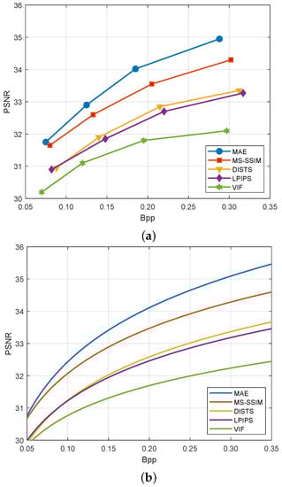 Since the five selected FR-QA metrics are differentiable almost everywhere, and the 4PL function is also differentiable,  supports backpropagation. In addition, as  is an approximation to DMOS of , a smaller  indicates a higher perceptual quality of the reconstructed frame . Therefore, in order to make the videos reconstructed by the DVC model have better perceptual quality, we optimize the DVC model by making  in Equation (11) equal to  in Equation (28). In addition, the normalization method used in this section allows the E2E-DVC model to obtain encoded videos with as similar bit rates as possible when trained with the same and different FR-QA optimizations.