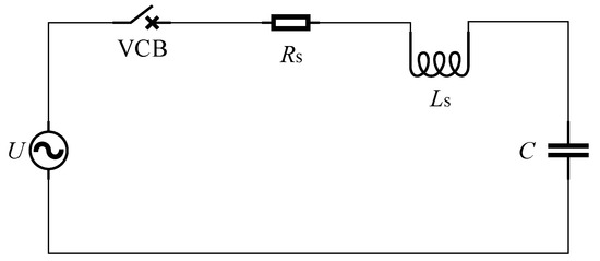 When the train is running, the overvoltage generated by opening the circuit breaker is less than that generated by closing it [20]. Therefore, the situation of the circuit breaker at closing is the key point. When the traction main transformer is in a no-load condition, the traction network voltage is 27.5 kV, the peak voltage is 38.9 kV, the inductance and capacitance storage in the on-board high-voltage system is zero, and the high-voltage system produces a zero-state response under the action of an external excitation source. An overvoltage much larger than 27.5 kV was generated in the EMU high-voltage system and propagated to the vehicle body and grounding system through the distributed capacitance between the high-voltage cable cores and shield of the rolling stock, causing violent fluctuations in the potential of both, and then a high-frequency oscillation process occurred in the circuit, generating an operating overvoltage of 6.10 kV at maximum. The magnitude of the operating overvoltage value when the circuit breaker closes is related to the phase angle at closing, the inductance, and the capacitive components in the circuit [20]. The main path of the vehicle body coupling of the operating overvoltage to the vehicle body when the circuit breaker closes is that the overvoltage is coupled to the shielding layer by the distributed capacitance between the core of the high-voltage cable and the shielding layer and then propagated to the vehicle body by the connection path between the shielding layer and the vehicle body, and this process can be equated to the core forming a path to discharge the vehicle body through the distributed capacitance of the core and the shielding layer. The simplified equivalent circuit model of overvoltage generated when closing the circuit breaker is shown in Figure 1, where U is the traction supply voltage, the main breaker is equivalent to the ideal switch, RS and LS are the equivalent impedances of the high-voltage system, and C is the distributed capacitance of the high-voltage cable core to the shield.
