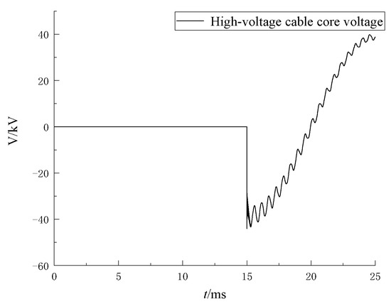 Using the above model, the overvoltage of the high-voltage cable core is simulated when the circuit breaker is closed with the net voltage phase of 0 and π/2, respectively. There is no overvoltage response when the net voltage phase is 0. The transient response voltage can reach 43.97 kV and high-frequency oscillation occurs when the net voltage phase is π/2. As shown in Figure 6, compared with the transient voltage response when opening the circuit breaker, the response voltage when closing the circuit breaker is smaller in amplitude but extremely high in oscillation frequency, which is more likely to be harmful to the on-board equipment, so the operating overvoltage when closing the circuit breaker is the focus.