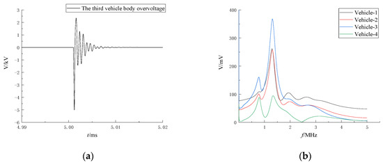 Overvoltage simulation waveform and frequency spectrum. (a) Overvoltage simulation waveform of the third vehicle body. (b) Overvoltage frequency spectrum of the first four vehicle bodies.