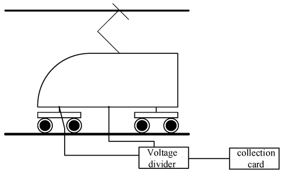 In this section, the operating main breaker overvoltage was analyzed in a certain type of real vehicle. The test is a static test in the garage during which the train pantograph catenary contacts and the main circuit breaker acts. The body overvoltage of the first four vehicles was monitored to obtain the distribution pattern under transient operating conditions. The test schematic diagram is shown in Figure 8. Each measuring point transmits the voltage signal through the transmission cable to the voltage divider and then through the coaxial cable to the data collector, and after digital processing, it is further processed by the monitoring system. The overvoltage collection point is shown in Figure 9. The operating overvoltage of the first four vehicles is acquired under the same network voltage phase, and the acquisition card records the four-way signal at the same time. Since the phase of the net voltage at the time of circuit breaker operation could not be determined during the test, the results of this test are the maximum values obtained after several acquisitions, and the phase of the net voltage is considered to be close to π/2 at this time.