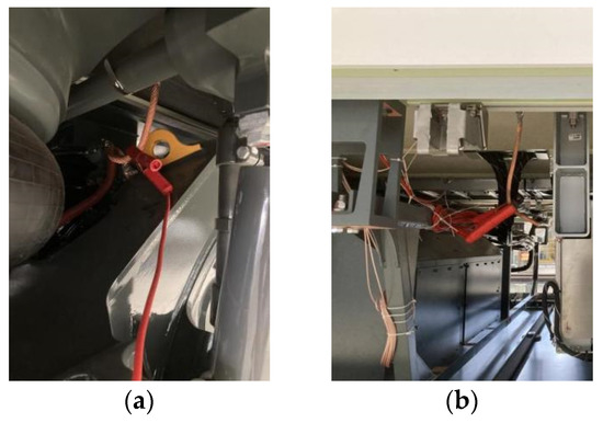 Overvoltage collection point. (a) The measuring points of the bogie and the vehicle body. (b) The measuring point of the equipment under the vehicle body.
