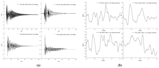 Overvoltage testing waveform and frequency spectrum. (a) Vehicles 1–4 operating overvoltage testing waveform. (b) Vehicles 1–4 operating overvoltage testing spectrum.