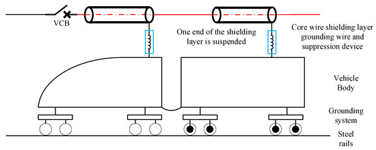 Since there is a problem of high overvoltage in the main breaker of the car operation of the moving train, it is important to study the method to suppress overvoltage. it can start from the three major elements of electromagnetic interference and can be divided into attenuating the source of interference, suppressing the propagation path, and improving the immunity of sensitive equipment. Considering the applicability of the overvoltage suppression method and the distribution method of the high-voltage cable of the EMU, the propagation path suppression method was easier to apply to the actual engineering. The shield of the high-voltage cable in the actual vehicle is not continuous, and each section of the shield is directly connected to the vehicle body at a single point, so the coupling path can be considered as a multi-section parallel circuit, and the shields of high-voltage cables of different trains are connected to the vehicle body, so the method of suppressing the overvoltage propagation path has generality. This paper explores a new type of vehicle operating main breaker overvoltage suppressor, which is connected in series between the high-voltage cable shield and the vehicle ground wire to achieve the suppression of the operating main breaker overvoltage without affecting the high-voltage cable shield grounding requirements. Its application location is shown in the blue box in Figure 11.
