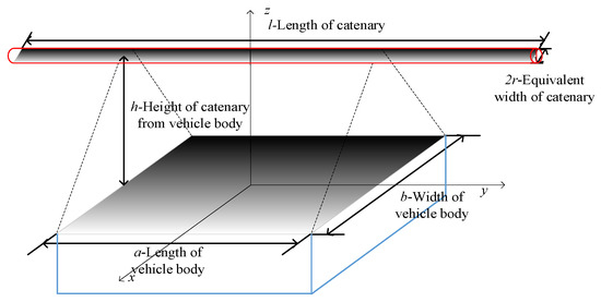 Assuming that h is the distance from the contact network to the vehicle body, the distributed capacitance between the contact network and the vehicle roof can be obtained by integrating 0 to h for distance z. The integration area is the area within the trapezoidal table of the thin strip and the vehicle body directly opposite the connecting line, as shown in Figure 14.