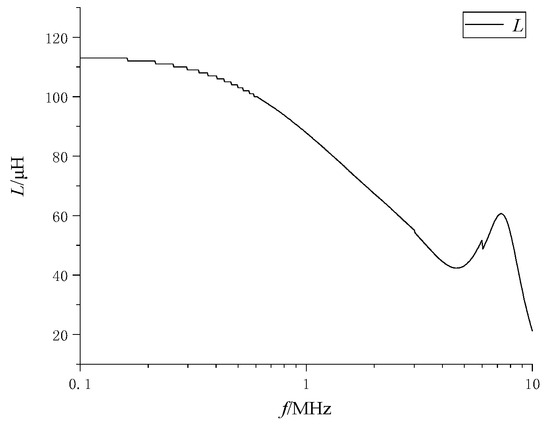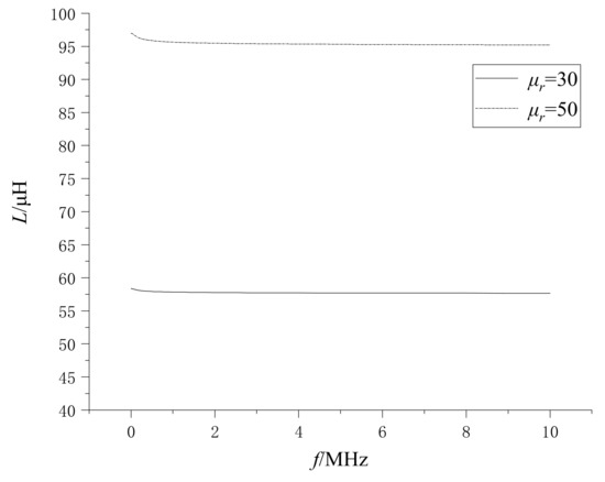where r1 is the outer radius of the core, r2 is the inner radius of the core, h is the height of the core, μ0 is the vacuum permeability, μr is the relative permeability of the core, and N is the number of turns of the coil. Setting r1 to 40 mm, r2 to 25 mm, h to 50 mm, and N to 20 turns, it is known that μ0 = 4π × 10 − 7 H/m, which is derived from Equation (4) as 26.6 < μr < 53.2.