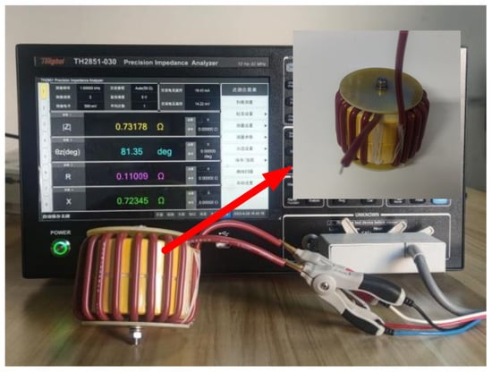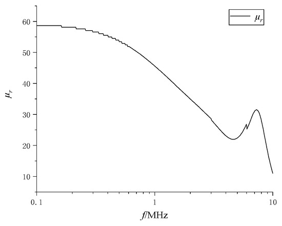 From the conclusion of the previous section, it is clear that the effective relative permeability of the iron powder core as a core material decreases with increasing frequency, as shown in Figure 17. The relative permeability of the magnetic core decreases from 57 to 35 in the overvoltage frequency band. The main parameters are listed in Table 8. The impedance analyzer TH2851-030, ChangZhou Tonghui Electronics Co., Ltd., Changzhou, China, was used to sweep the suppressor from 100 kHz to 10 MHz with a sweep voltage of 500 mV. The site layout is shown in Figure 18 and the impedance curve is shown in Figure 19.