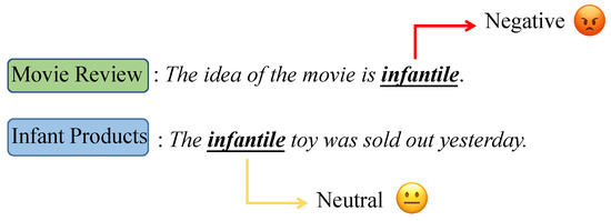 Regardless of the chosen method, there are two primary issues that need to be considered: domain dependence and the requirement for a sizeable annotated corpus. Domain dependence pertains to the fact that a classifier trained on a specific domain may not perform as well in other domains due to differences in the meanings of vocabulary across domains, such that the same word may convey divergent meanings in different domains. As depicted in Figure 1 and noted in the work of Cai et al. [9], the word “infantile” frequently connotes a negative sentiment in the domain of movie reviews (for instance, “The idea of the movie is infantile”), whereas in evaluations of infant products (such as “The infantile toy was sold out yesterday”), there is typically no overt emotional valence. In order to train classifiers for different domains of text, it is crucial to have a sufficient amount of labeled data for each domain. Unfortunately, not all domains have an adequate amount of domain-specific text to train on. Therefore, we must leverage text corpora from diverse domains to effectively classify text from a specific domain. This approach is known as Multi-Domain Text Classification (MDTC) and has been explored in previous research [10,11]. However, conventional MDTC methods [11,12] tend to overlook an important piece of information: different domains present varying levels of difficulty in classification.