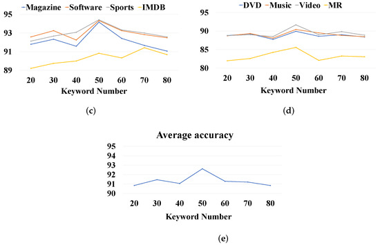 The accuracy of different numbers of keywords on the FDU-MTL dataset, using KeyBERT as the keyword selection method. (a) The accuracy of different numbers of keywords on Books, Electronics, Kitchen, Apparel domain of FDU-MTL dataset, using KeyBERT as the keyword selection method. (b) The accuracy of different numbers of keywords on Camera, Health, Toys, Baby domain of FDU-MTL dataset, using KeyBERT as the keyword selection method. (c) The accuracy of different numbers of keywords on Magazine, Software, Sports, IMDB domain of FDU-MTL dataset, using KeyBERT as the keyword selection method. (d) The accuracy of different numbers of keywords on DVD, Music, Video, MR domain of FDU-MTL dataset, using KeyBERT as the keyword selection method. (e) The average accuracy of different numbers of keywords on the domain of FDU-MTL dataset, using KeyBERT as the keyword selection method.