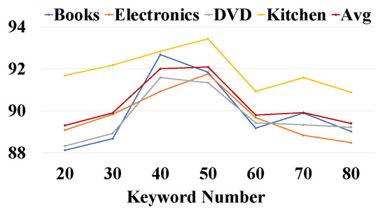 As for the Amazon-review dataset, while there are two domains that achieve the best classification accuracy at both 40 and 50 keywords individually, the average classification accuracy across all domains is slightly higher for 50 keywords than for 40 keywords. Therefore, we still consider 50 keywords to be the optimal choice for ordering in this dataset.