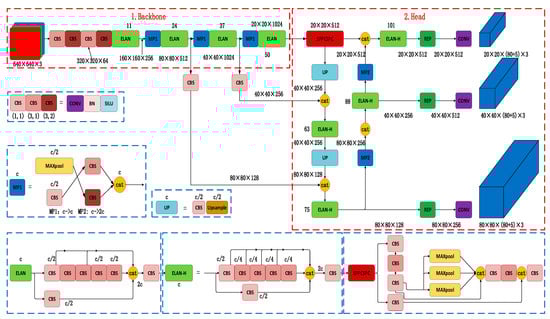 The YOLOv7 algorithm was proposed by Wang et al. [] in July 2022, using E-ELAN, cascade-based models (concatenation-based models), model scaling [], convolutional reparameterization [], and other strategies to outperform all known target detectors in the range from 5 frame/s to 160 frame/s in terms of speed and accuracy. As shown in Figure 1, the YOLOv7 network structure consists of four parts: input, backbone, head, and prediction. Mosaic data enhancement is used in input to improve the training speed of the model and the accuracy of the network, and adaptive anchor frame calculation and image scaling are used to enrich the data set and add small sample targets to further optimize the network in terms of training speed and reduce the memory requirement for training the network model. The backbone module processes the input high-dimensional data and extracts image features of different scales, which are composed of several BConv layers, E-ELAN layers, and MPConv layers. The BConv layer consists of a convolutional layer + BN layer + ReLU activation function for the extraction of target features; the E-ELAN layer maintains the original ELAN design architecture, learns more diverse features by guiding the calculation blocks of different feature groups, improves the learning ability of the network without damaging the original gradient path, and extends cardinality in the computational block section to perform OSA Module related operations in VOVNet; and the MPConv convolutional layer adds a Maxpool layer to the BConv layer to form two branches, the upper branch halves the image aspect through Maxpool and halves the image channel through the BConv layer. In the lower branch, the image channels are halved by the first BConv layer, and the image aspect is halved by the second BConv layer, and finally, the features extracted from the upper and lower branches are fused using the Cat operation to improve the feature-extraction capability of the network. The head is composed of a path aggregation feature pyramid network (PAFPN) [] structure, which processes the feature maps extracted by the backbone and functionally includes feature fusion and classification positioning prediction. It is composed of the SPPCPC layer, BConv layer, MPConv layer, Catconv layer, and RepVGG block layer. After outputting the feature map, it outputs different sizes of unprocessed prediction results through REP and Conv layers. By introducing a bottom-up path, it is easier for low-level information to be transmitted to high-level information, thus achieving an efficient fusion of features at different levels; the prediction module adjusts the number of image channels for three different scale features of P3, P4, and P5 output by PAFPN using the REP (RepVGG Block) structure [], and finally passes through 1 × 1 convolution used for predicting confidence, categories, and anchor boxes.