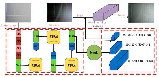 In order to improve the detection accuracy of bolt mesh in the downhole environment, this paper improves the YOLOv7 network as follows: Firstly, a pre-processing image link is added to the input front-end to brighten and defog the image. Secondly, the attention mechanism CBAM module is added to the front end of the MP1 module in the YOLOv7 backbone network to enhance the attention of the network for detecting targets. Finally, the activation function in the Conv module is replaced with LeakyReLU to improve the network feature expression capability, and the framework of the improved algorithm is shown in Figure 2.