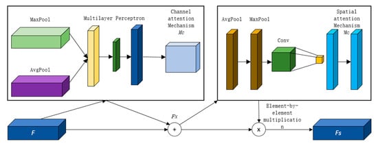 In Figure 5, MC is the channel attention in the convolutional block attention model, and Ms is the spatial attention. Given the feature map , where C is the number of channels in the feature map, H × W is the size of the feature map, and is the 3D matrix composed of C, H, and W.