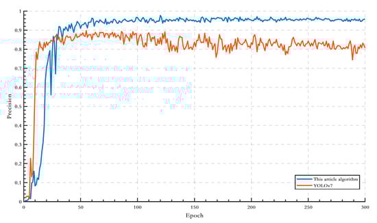 From Figure 8, it can be seen that the mAP (mean average precision) values of the algorithm in this paper are significantly higher than those of the YOLOv7 network.