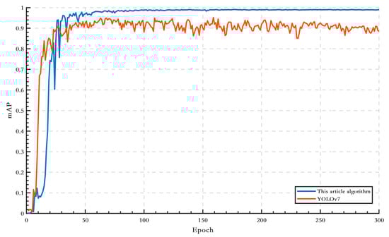 From Figure 7, it can be seen that the final stable accuracy of the YOLOv7 algorithm is low, only about 0.82; meanwhile, it is still difficult to achieve complete convergence in the later stage. In contrast, the final accuracy of the algorithm in this paper is stable at about 0.95, while the accuracy changes in the late iterations fluctuate less. mAP curve comparison results are shown in Figure 8.