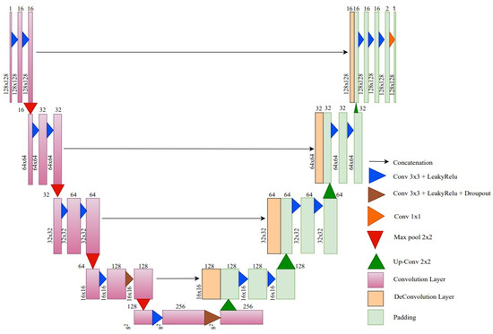 We employed the UNET architecture [32] to train the noisy signal which is illustrated in Figure 2. The model architecture includes a pathway that expands on the left and shrinks on the right. The shrinking path follows the typical design of a convolutional network where a leaky rectified linear unit (ReLU) and a 2 × 2 max pooling operation with a stride of two are used for downsampling after every two 3 × 3 convolutions applied in succession. As we downsample at each step, we increase the number of feature channels by a factor of four.