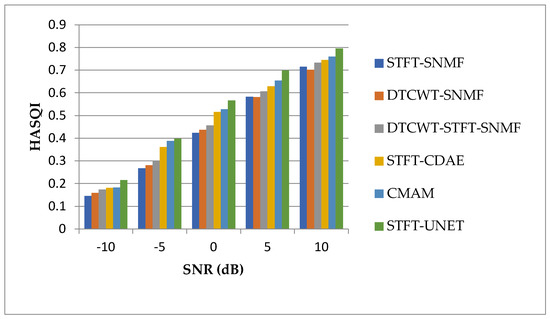 Comparison of HASQI values for six different methods under five SNR conditions.