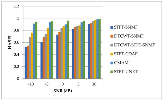 Comparison of HASPI values for six different methods under five SNR conditions.