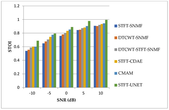 The PESQ findings are outlined in Figure 5, which demonstrates the proposed strategy performance across five SNR conditions. As seen in Figure 5, the proposed strategy outperforms the other five approaches in all SNR situations. In terms of STOI results in Figure 6, the proposed system’s deep learning approach using UNET has preferentially increased the STOI scores over high SNR in low SNR situations.