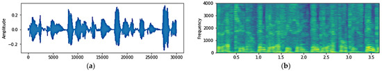 Original time-domain waveform and spectrogram. (a) Original speech waveform, (b) original speech spectrogram.