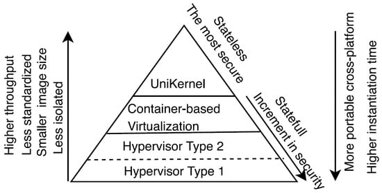 One effective solution to address these challenges is to introduce virtualization concepts during the teaching process. Virtualization involves creating an abstraction layer that enables the creation of virtual hardware over physical hardware []. Authors in [] provide valuable insights by stating that “implementing virtualization technology is a way to relax the physical hardware constraints and increase a system’s flexibility”. Virtualization, with the appropriate abstraction, has the potential to transform the noted heterogeneity into a more homogeneous environment. Various virtualization techniques are employed today, and Figure 1 presents a graphical comparison of some of their fundamental characteristics [].