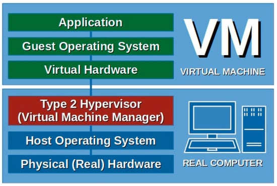 In the domain of higher education, the prevalent solutions for virtualization implementation utilize type 2 hypervisors. Type 2 hypervisors, also known as Virtual Machine Managers (VMMs) are software installed on the existing computer operating systems (host systems). They enable the creation and management of virtual machines (VMs) using virtual hardware. Each VM operates in an isolated environment with its own operating system (guest system). Standard operating systems commonly used on physical computers (such as Windows, Linux, macOS, and others) can be utilized without the need for specialized or dedicated operating systems. This flexibility allows us to seamlessly use almost all applications in a virtual environment, just as we would in a physical environment. Consequently, VMs are ideal for educational purposes and student use, as they eliminate the need for additional knowledge or training in application usage. Figure 2 illustrates a graphical representation of the fundamental layers in the virtualization architecture, which is extensively employed in the field of higher education.