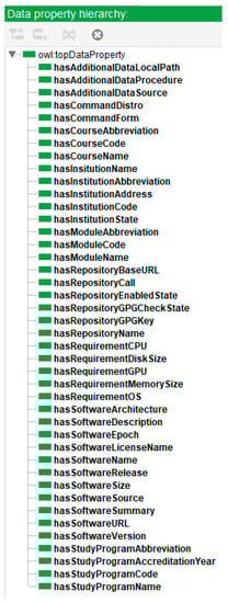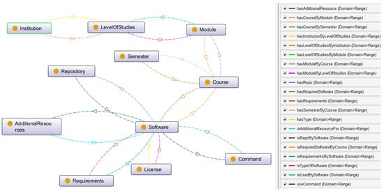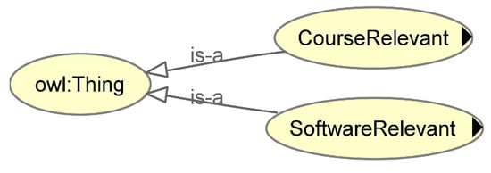 The topmost class, owl:Thing, is a predefined class in OWL2 that serves the purpose of providing an appropriate class hierarchy []. Under this class, two major subclasses have been defined: CourseRelevant and SoftwareRelevant, as depicted in Figure 3.