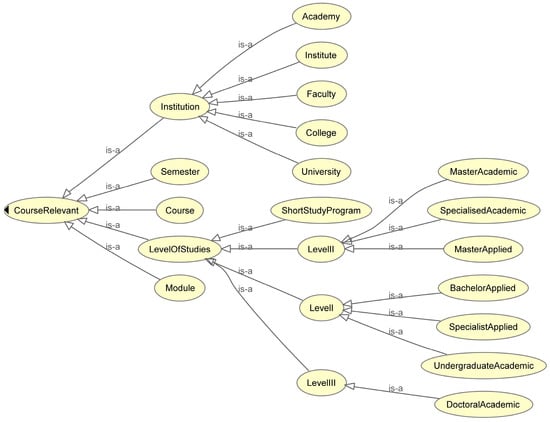 Figure 4 illustrates the key subclasses within the CourseRelevant class. These subclasses were identified by referring to the system of higher education in the Republic of Serbia, as outlined in the Law on Higher Education []. The institution itself (class Institution) plays a crucial role in carrying out activities related to academic education. It implements study programs at different levels, referred to as LevelOfStudies class, following the national classification of study levels within the Serbian educational system []. Study programs are organized into various study modules (Module class). Each course (Course class) attended by students is associated with a specific module within the study program, and each course is offered in a particular semester (Semester class). The subclasses within CourseRelevant provide more detailed implementation, as depicted in Figure 4.