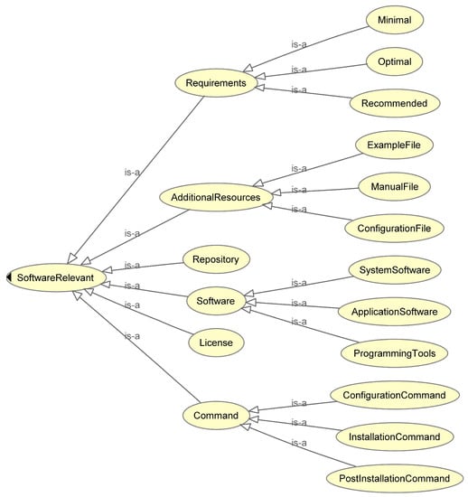 Similarly, for the classes related to the SoftwareRelevant domain, the following relationships apply: Software has Requirements, Software has License, Software has Command, Software has Repository and Software has AdditionalResources.