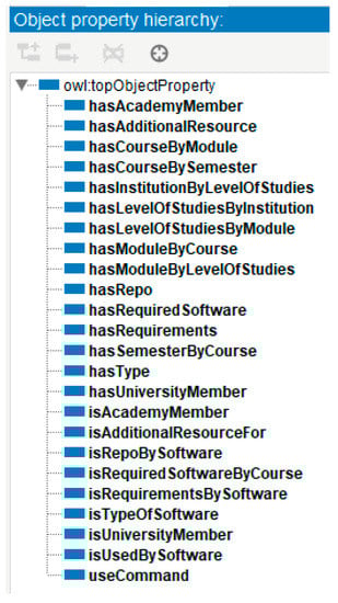 Figure 6 illustrates the object properties as implemented in the Protégé environment. All object properties are defined as sub-properties of owl:topObjectProperty, which serves as the topmost object property in OWL2, providing a hierarchy for object properties.
