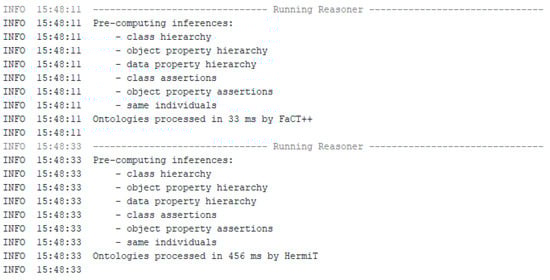 These defined elements provide the necessary knowledge for the end user, the student, to apply them correctly during the software installation process, as discussed in previous sections. To ensure the adequacy and absence of deficiencies in the ontology, two reasoners, FaCT++ 1.6.5 and HermiT 1.4.3.456, were employed during the ontology design. Figure 9 shows the log record generated within the ontology development environment, indicating that both reasoners started without any errors.