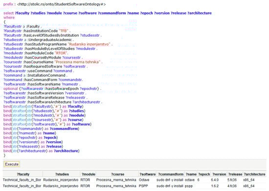 The input data are provided through a list of elements gathered from the existing higher education institution information system for the corresponding user, in this case, the student. In the example depicted in Figure 10, the student is studying at the Technical Faculty in Bor (TFB), pursuing an undergraduate academic study program called Mining Engineering (Rudarsko inzenjerstvo), within the Recycling Technologies and Sustainable Development module (RTOR). The specific course being studied is Process Measurement Technique (Procesna merna tehnika). Based on these input data, the corresponding SPARQL query retrieves information about the software used in the course. Attributes such as software name, epoch, version, release, and architecture are read, and using the commandform structure for installing software on Linux, obtained from the ontology, the appropriate installation command is generated for each software instance. These commands are then executed in the virtual machine’s operating system using system commands provided by the os Python standard library.