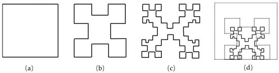 The design presented in this study revolves around the integration of both the folding structure and the Minkowski fractal structure. Notably, the Minkowski fractal structure emerges from the iterative addition and scaling of regular triangular, square or circular geometries within the plane or space [,,,]. This intricate structure possesses remarkable attributes of self-similarity, complexity and fractal dimension, enabling the reconfiguration of both the size and performance of the antenna. Consequently, leveraging Minkowski fractal structures in the design of multi-band and miniaturized antennas offers substantial advantages and unrivaled potential.