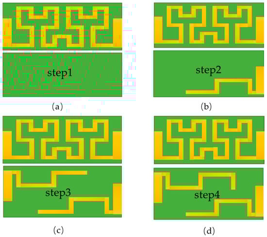 Antenna design steps. (a) The first step of the design steps; (b) The second step of the design steps; (c) The third step of the design steps; (d) The fourth step of the design steps.