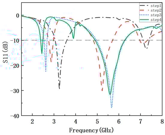 In order to further understand the radiation mechanism of the antenna, the following material will briefly describe the antenna design method. The simulation tool used in the antenna design in this study is 2020 Ansys HFSS 3D high-frequency simulation software. Figure 3 illustrates the progressive stages of the antenna design process. The initial design centers around the compact arrangement of the first-order Minkowski fractal array structure, aiming to minimize the overall size without compromising the desired radiation characteristics. This unique structure inherently enables the realization of multi-band antennas. By strategically bending the antenna array structure, additional frequency bands can be excited, thereby expanding the antenna’s operational range. Furthermore, the electromagnetic interaction among the branches facilitates the generation of enhanced radiation currents, ultimately elevating the antenna’s gain.
