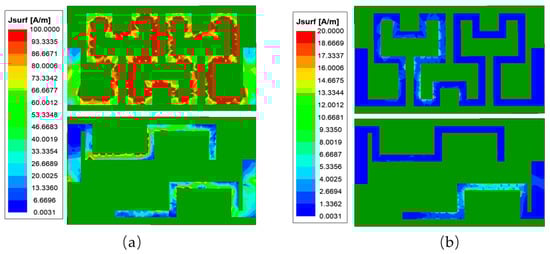 Antenna surface current excitation diagram. (a) Antenna surface current excitation diagram at 2.44 GHz; (b) Antenna surface current excitation diagram at 5.6 GHz.