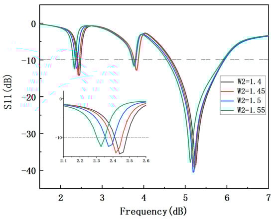 Figure 7 is a parameter scan of the parameter W2, where the scan range is 1.4–1.55 mm, the scan step is 0.5 mm and the branch W2 on the 2.4 GHz band becomes larger as the operating frequency becomes lower. When W2 = 1.45 mm, it can cover more of the 2.4 GHz band, so the parameter W2 is determined as 1.45 mm.
