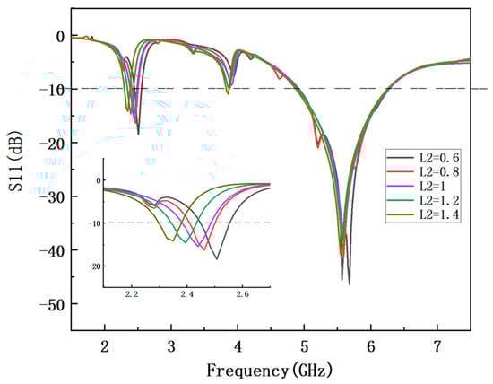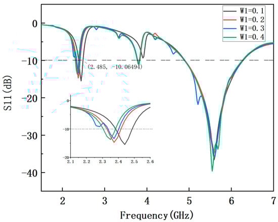 Figure 8 determines that W1 = 1.45 mm. In the parameter scan of W1, the scan range is 0.1–0.4 mm and the influence of parameter W1 on the 2.4 GHz band becomes larger as the frequency becomes lower. Even a small increase in W1 can have a greater impact on the 2.4 GHz band. When W1 = 0.1 mm, it can cover more of the 2.4 GHz band, so this determines that W1 = 0.1 mm.