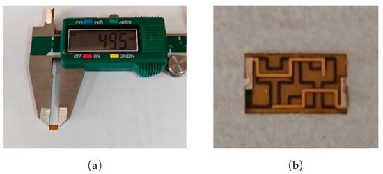 To validate the simulated antenna model, a prototype of the proposed multi-band antenna is fabricated, as depicted in Figure 10, the physical properties of the antenna are shown in Table 2. The antenna’s maximum size does not exceed 5 mm. FPC (flexible printed circuit board) technology is employed to fabricate the antenna structure, and the dielectric material used is polyimide with a dielectric constant (εr) of 3.5 and a loss angle tangent (δ) of 0.008. Due to the small size of the antenna and the close spacing of the branches, a layer of protective oil is applied to the antenna’s exterior to prevent short circuits and friction between the branches that could damage its performance.
