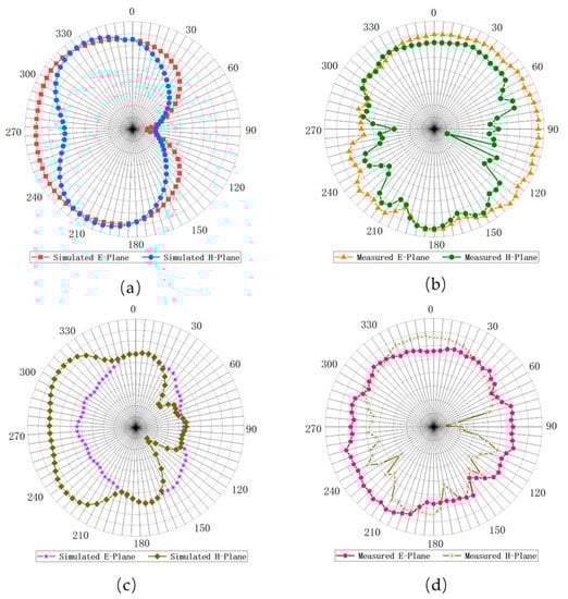 Antenna EH plane pattern. (a) Simulated pattern at 2.45 GHz (b) Measured pattern at 2.45 GHz (c) Simulated pattern at 5.2 GHz (d) Measured pattern at 5.2 GHz.