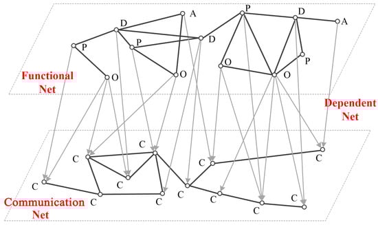 According to the network model described in Definition 3, the network structure of the DGCN for CSOS is given for a certain combat scenario, as shown in Figure 1. In the figure, the functional net is composed of nodes and edges corresponding to four combat units including O, P, D, and A, and the communication net is composed of nodes corresponding to different communication support units. Based on the dependent net, the functional net and the communication net form asymmetric coupling relations.
