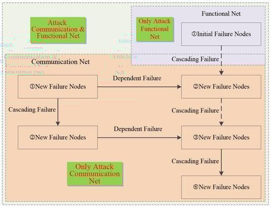 Different attack modes may have different effects on robustness. Combining the asymmetric dependent failure model and overload cascading failure model, the failure process of the DGCN of CSOS can be represented as Figure 6, in which the dashed boxes of three different colors represent different attacked objects. These nodes in a double-layer network will suffer random attacks or intended attacks. As can be seen from the figure, the failure process of the communication net always leads to the failure of the functional net, so the functional net is more fragile. Any disturbance in the network may cause serious consequences of “failure, disconnection and paralysis”.